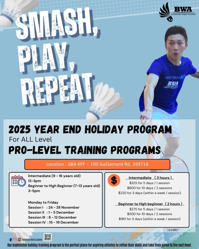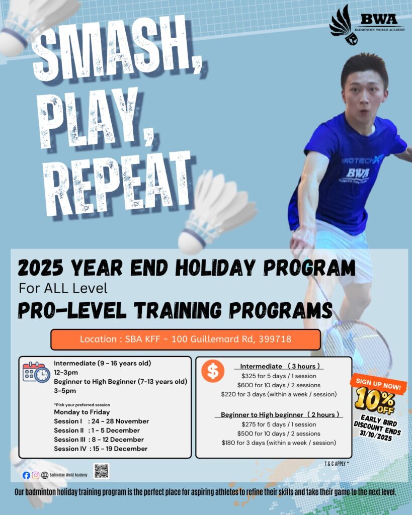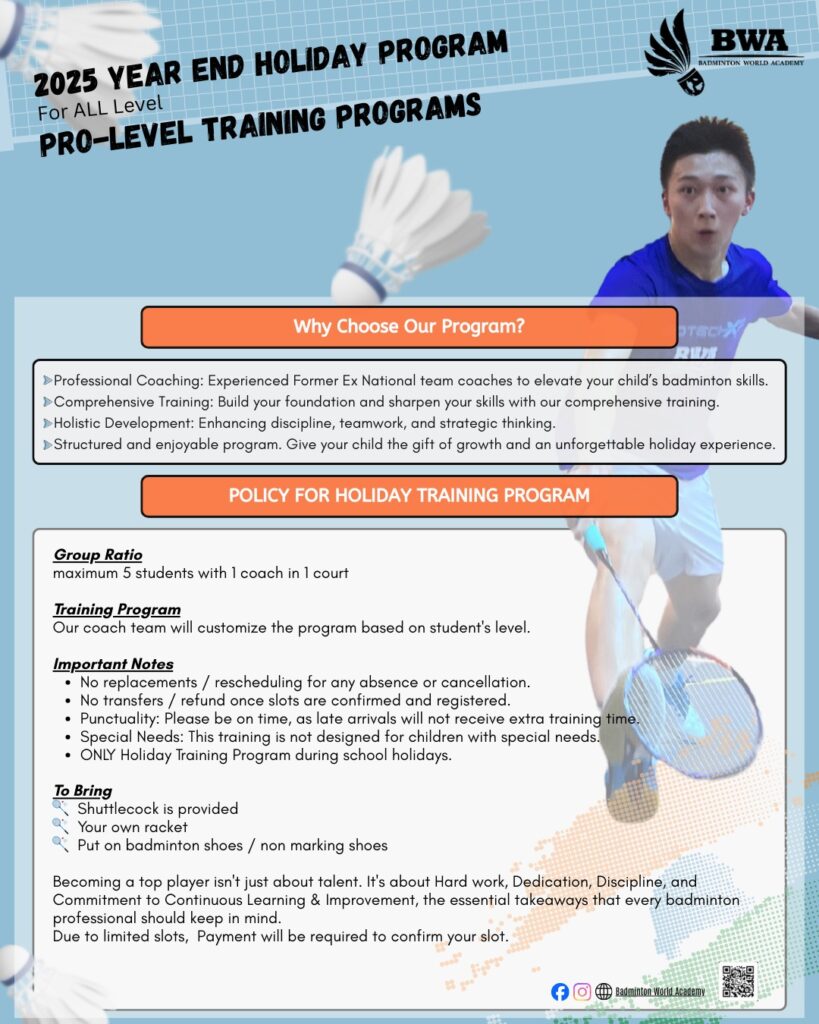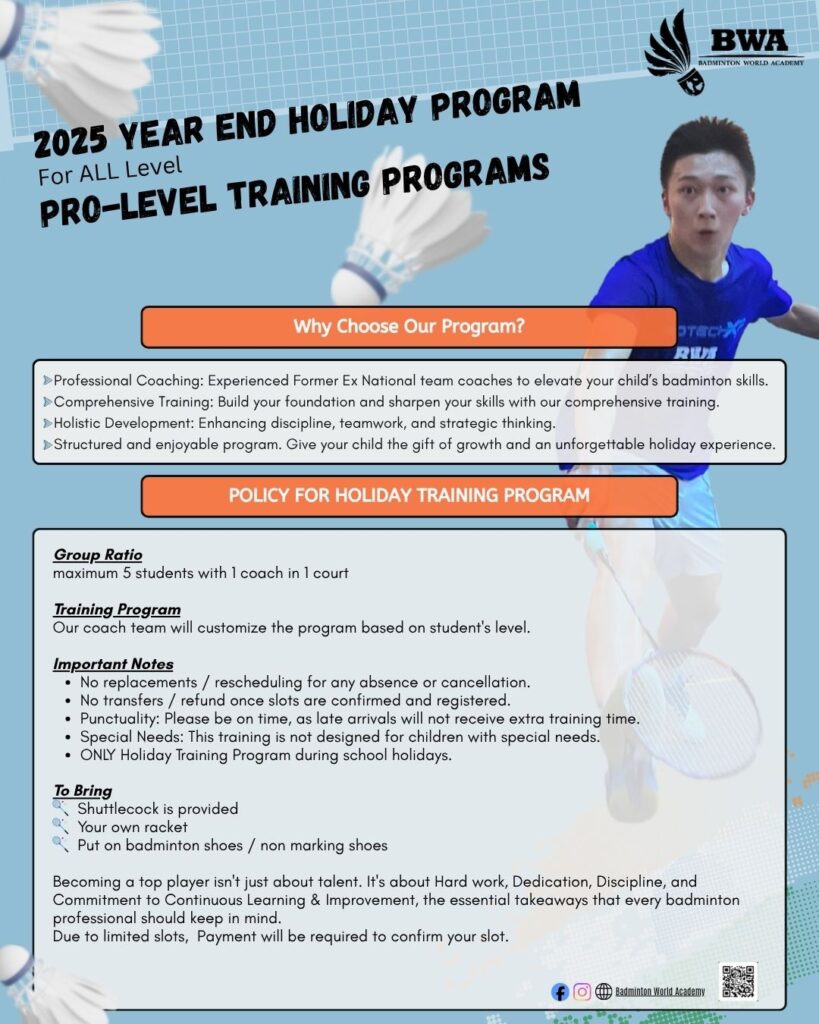 Get ready to elevate your kids’ badminton game to new heights through our comprehensive holiday camp training! Join our dedicated coaches as they help your child learn about crucial techniques, discipline and mindset used by professional badminton players themselves.